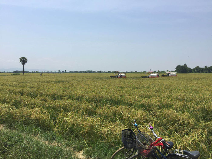 盡管當天緬甸實時氣溫高達38℃,但依然無法阻擋大家現場參觀緬甸合資公司生產基地的熱情。正值當地水稻旱季制種收獲季節,在基地工作人員的帶領下,大家興致勃勃地一起觀摩了機械化收獲雜交水稻種子。看到一臺臺收割機在隨風搖曳生姿的稻田中來回穿梭,然后再將一顆顆金燦燦的種子運輸到倉庫曬場,豐收的喜悅洋溢在在場每一個人的臉上,仿佛看到了這一顆顆滿載希望的種子為緬甸農民帶來更大的豐收,這是一個多么生動美妙的時刻!