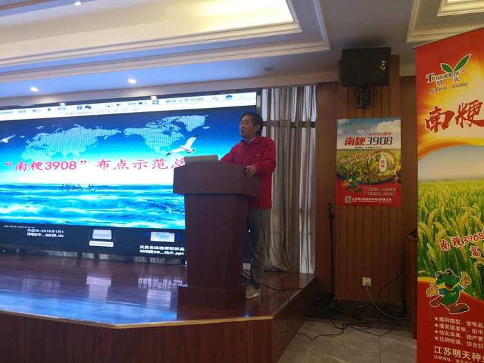 楊地龍副總經理向大家介紹“南粳3908”兩年來在各地示范種植的優異表現;各地的示范種植代表也踴躍發言,向大家分享了兩年來“南粳3908”在當地的表現,從喜悅的心情能看出大家對品種的認可和對品種的信心。
