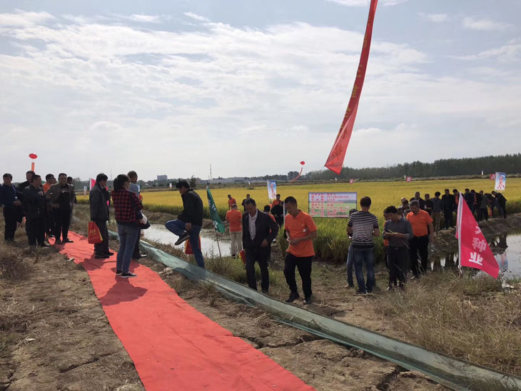 10月11日上午在天門,來自江漢平原各地近百名代理商、種田大戶乘坐大巴一同前往天門市干一鎮八團村“蝦稻共作”基地,觀摩“富美占”示范片。田間觀摩由天門代理商代磊主持,他主要從品種的抗倒性、豐產性等方面為大家做了詳細的介紹。眾所周知,蝦稻共作對品種的抗倒性要求極高,在田間,與富美占相鄰田塊的其他品種均出現了不同程度上的倒伏,而富美占依然屹立不倒,參會代表們分析主要還是得益于富美占這個品種本身株高較矮、莖稈粗壯韌性強并且株型緊湊等特點,可以說品種抗倒性較強的優勢通過示范片體現的淋漓盡致,得到了參會人員的高度評價!
