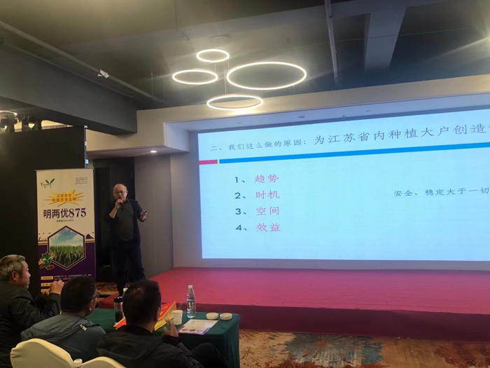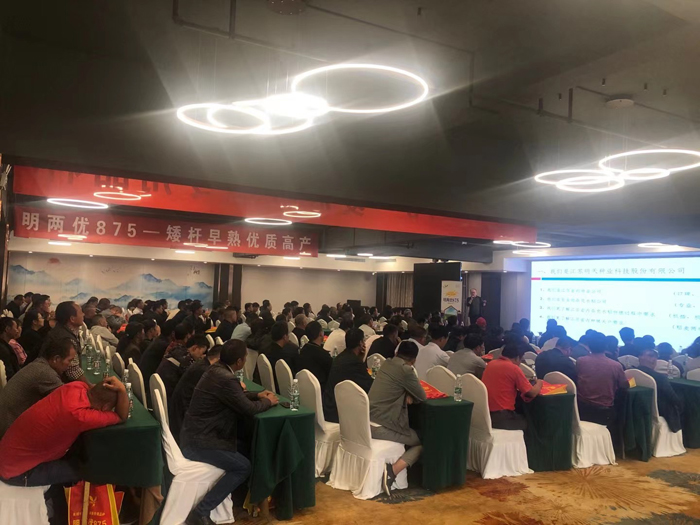 會議首先由盧偉林經(jīng)理向參會代理商、種植大戶、育秧合作社代表介紹明兩優(yōu)875的特征特性以及今年各縣市示范田間表現(xiàn)情況。盧經(jīng)理介紹到隨著土地流轉,種植大戶越來越多,雜交水稻移栽成本居高不下、人工緊缺,大戶用工難、收益低。明兩優(yōu)875的生育期、抗倒性、抗病性及產(chǎn)量結構就特別適合當下種植大戶和育秧合作社做雜交稻麥后機插種植。因此雜交水稻的麥后機插勢不可擋,明兩優(yōu)875應勢而出,適時填補了江蘇淮北雜交水稻麥后機插合法品種的空白。同時詳細介紹了明兩優(yōu)875的栽培管理措施。